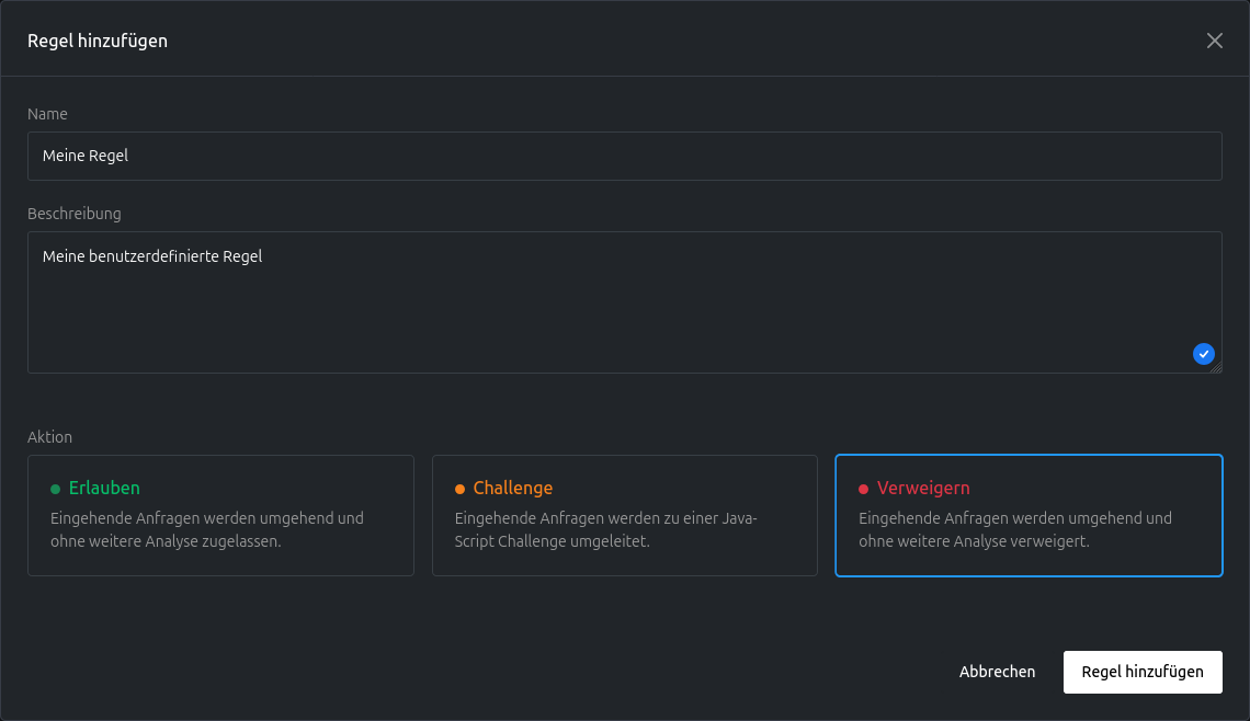 Unter einer Regel ist eine Sammlung an sog. "Oder-Gruppen" zu verstehen, welche bei Erfüllung eine bestimmte Aktion nach sich ziehen. Die Aktion besteht entweder im Erlauben, Verweigern oder Weiterleiten zu einer JavaScript-Challenge einer Anfrage. Die ausgewählte Aktion wird immer dann angewendet, wenn mindestens eine Oder-Gruppe der jeweiligen Regel erfüllt ist.