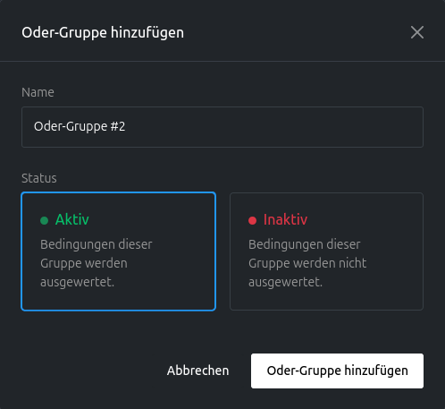 Definieren Sie innerhalb einer Oder-Gruppe die Bedingungen, welche erfüllt sein müssen, damit die Oder-Gruppe greift.