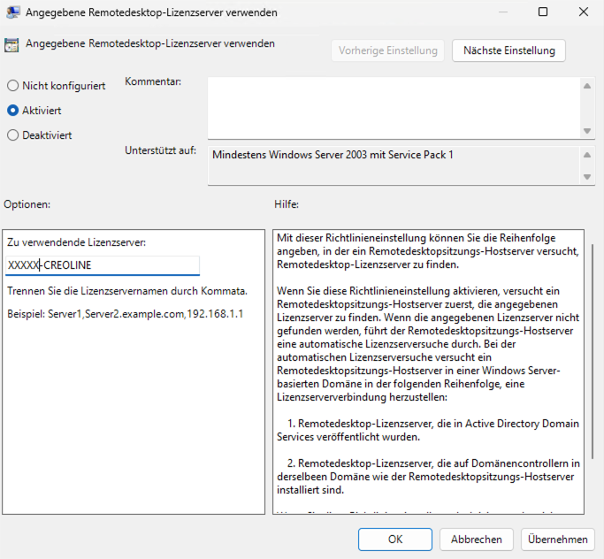 Tragen Sie hier den Namen des Lizenzservers ein z.B. XXXXX-CREOLINE (Servername) und Aktivieren Sie die Richtlinie. Bestätigen Sie die Änderungen wieder über die Schaltfläche Übernehmen.