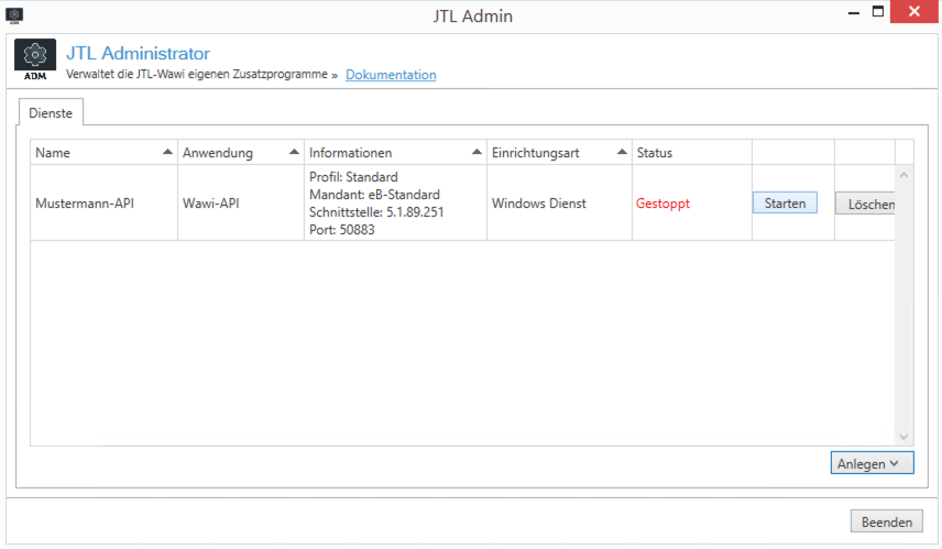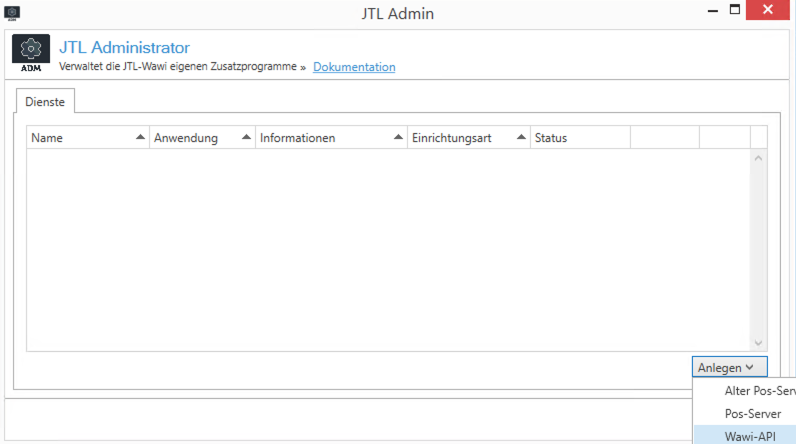 C:\Program Files (x86)\JTL-Software\JTL-Administrator.exe Führen Sie die o.g. Anwendung als Administrator (Rechte Maustaste + Als Administrator ausführen) aus und wählen Sie unter Anlegen die Option Wawi-API aus:
