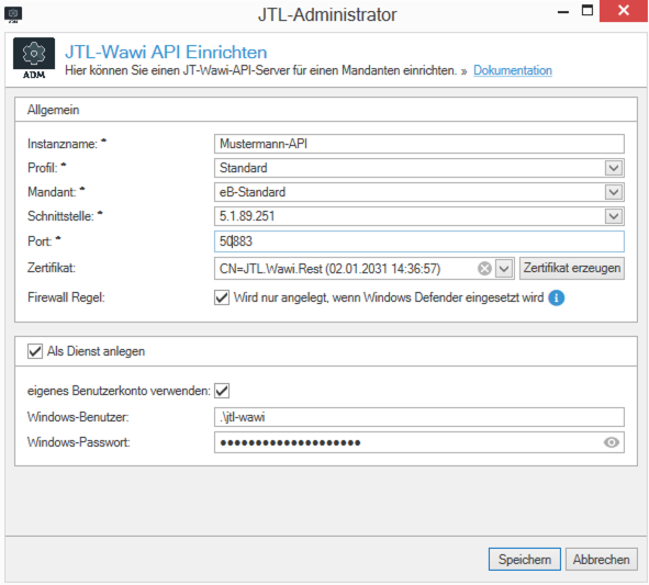 Geben Sie in dem darauffolgenden Fenster die Zugangsdaten für den zu verwendenden Windows-Benutzer ein und legen Sie die weiteren Verbindungsinformationen fest. Wir empfehlen Ihnen, anstatt dem Standard-Port 5883 einen alternativen Port zu verwenden (bspw. 50883 o.ä.). Zusätzlich dazu müssen Sie über die Schaltfläche Zertifikat erzeugen noch ein Zertifikat erstellen, welches von anderen Anwendungen zum Herstellen einer HTTPS-Verbindung genutzt werden kann. Bestätigen Sie die Angaben anschließend mittels der Schaltfläche Speichern. :