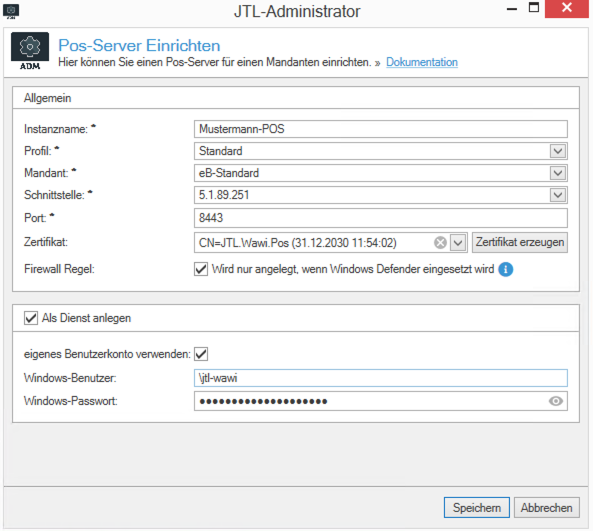 Geben Sie in dem darauffolgenden Fenster die Zugangsdaten für den zu verwendenden Windows-Benutzer ein und legen Sie die weiteren Verbindungsinformationen fest. Wir empfehlen Ihnen, anstatt dem Standard-Port 443 einen alternativen Port zu verwenden (bspw. 8443 o.ä.). Zusätzlich dazu müssen Sie über die Schaltfläche Zertifikat erzeugen noch ein Zertifikat erstellen, welches von anderen Anwendungen zum Herstellen einer HTTPS-Verbindung genutzt werden kann. Bestätigen Sie die Angaben anschließend mittels der Schaltfläche Speichern. :