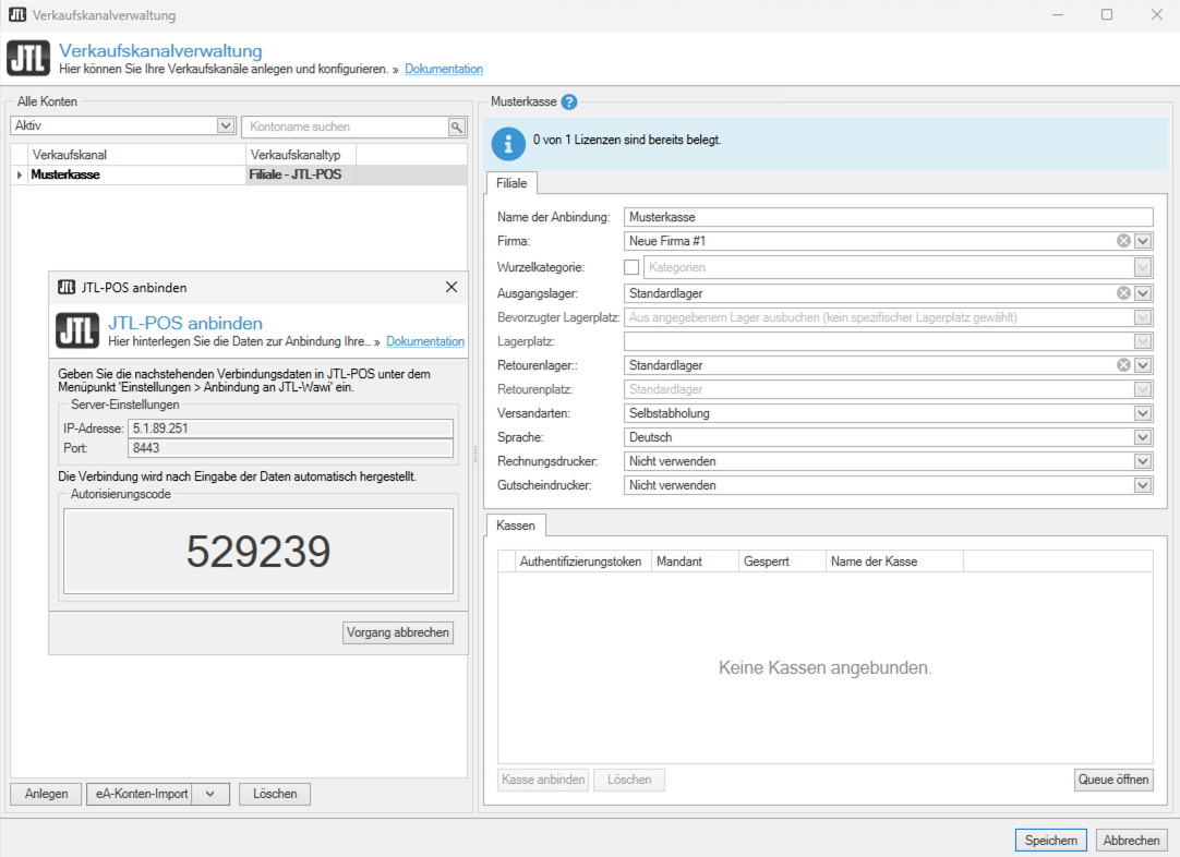 Tragen Sie die entsprechenden Informationen zu der Filiale usw. ein und verwenden Sie die Schaltfläche Kasse anbinden, um sich die benötigten Verbindungsinformationen zu der Kasse anzeigen zu lassen:
