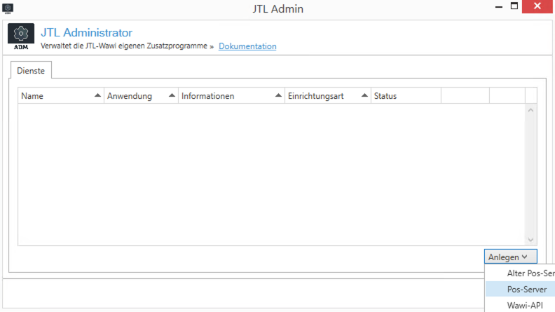 C:\Program Files (x86)\JTL-Software\JTL-Administrator.exe Führen Sie die o.g. Datei als Administrator (Rechte Maustatse + Als Administrator ausführen) aus und wählen Sie unter Anlegen die Option POS-Server aus: