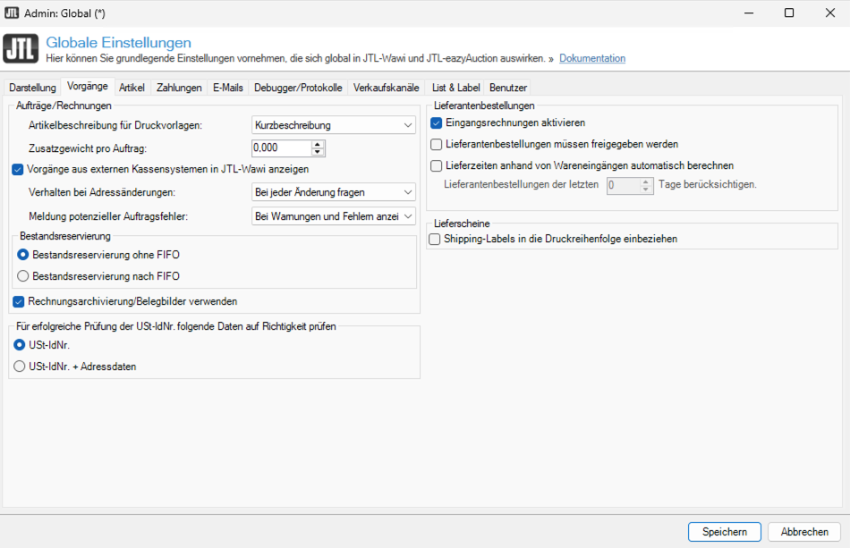 Wählen Sie in der obersten Menüleiste Admin → Globale Einstellungen aus und wechseln in dem Einstellungsfenster zu dem Reiter Vorgänge.