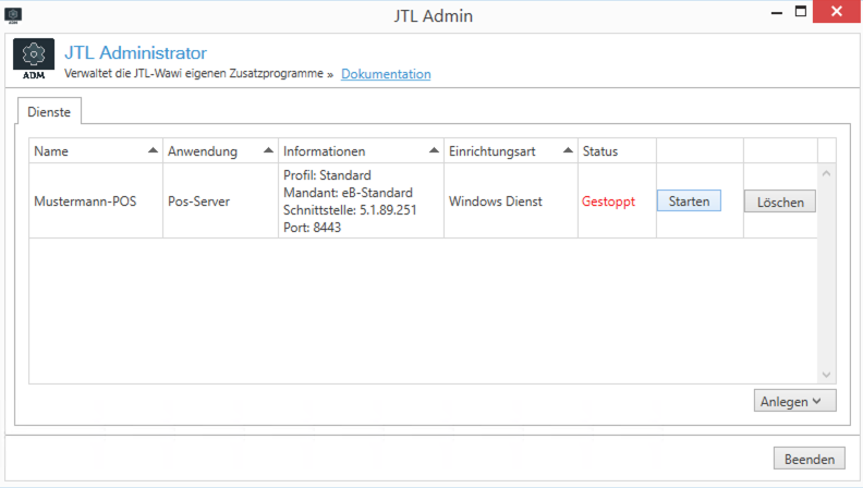 Starten Sie im nächsten Schritt den JTL-POS-Server über die Schaltfläche Starten:
