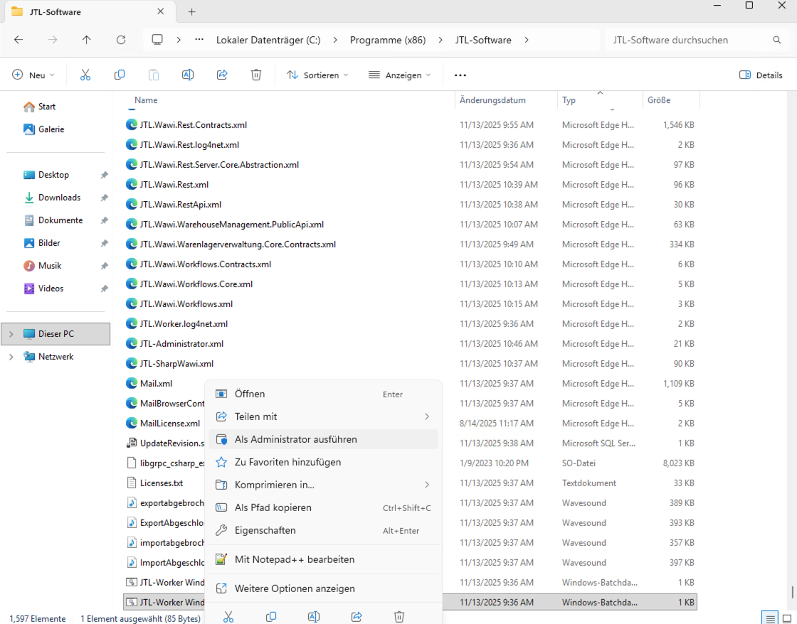 C:\Program Files (x86)\JTL-Software\JTL-Worker Windows Dienst Installieren.bat Führen Sie die o.g. Datei als Administrator aus: