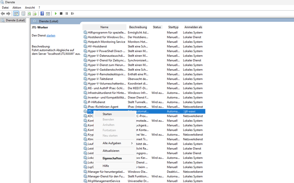 Navigieren Sie anschließend zu dem Dienst JTL-Worker, verwenden Sie die rechte Maustaste und danach die Schaltfläche Starten, um den JTL-Worker als Windows-Dienst zu starten.