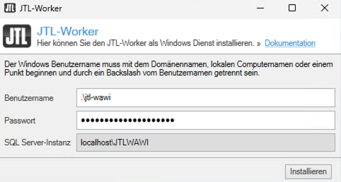 Verwenden Sie im nächsten Schritt die Zugangsdaten des gewünschten Windows-Benutzers, um den JTL-Worker für diesen Benutzer als Dienst einzurichten. Verwenden Sie danach die Schaltfläche Installieren, um die Einrichtung des JTL-Workers als Windows-Dienst für den gewünschten Benutzer abzuschließen: