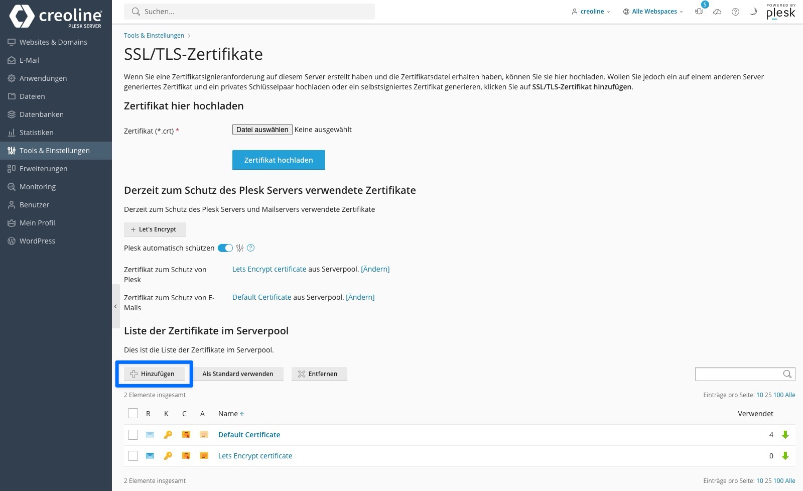 Sobald Sie im Plesk Control Panel angemeldet sind, navigieren Sie zu Tools & Einstellungen → SSL/TLS-Zertifikate. Hier sehen Sie die Liste der Zertifikate, die bereits im Serverpool installiert worden sind.