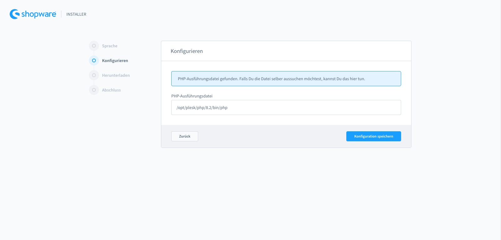 Auf der nachfolgenden Seite können Sie die PHP-Ausführungsdatei anpassen, falls diese nicht automatisch durch den Installer vorgeschlagen wird. Diese befindet sich im Normalfall unter: