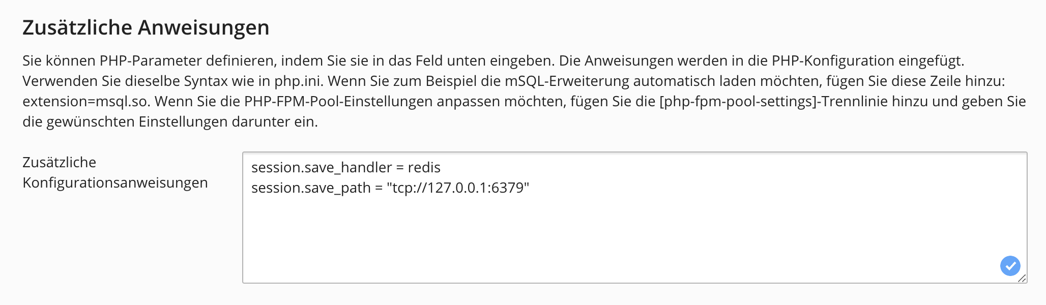 session.save_path = "tcp://127.0.0.1:6379?database=2" Nachdem die Einstellungen gespeichert wurden, startet der PHP-Dienst automatisch neu, sodass alle PHP-Sessions ab sofort über den Redis-Server gesteuert werden.