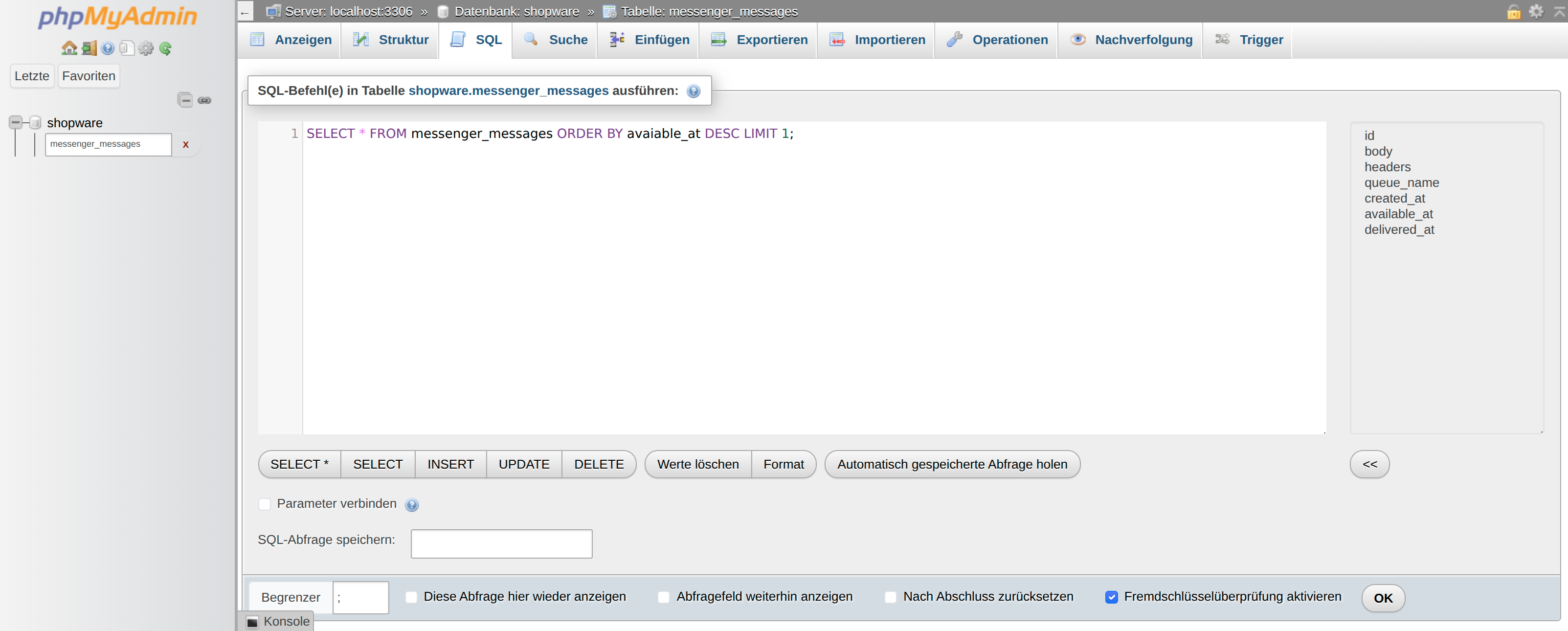 SELECT * FROM messenger_messages ORDER BY available_at DESC LIMIT 1; If the date is already in the past, these entries are quickly removed from the database after the transports have been processed in the message consumer. Entries with a date in the future remain in the database until this time.