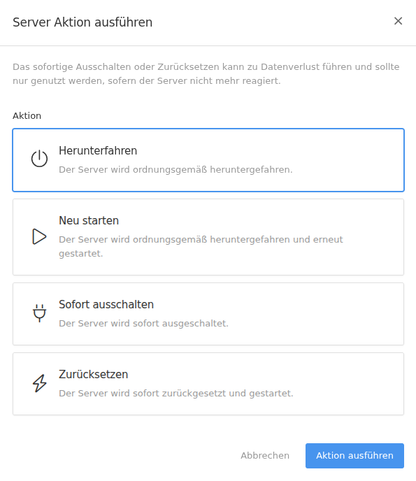 To shut down the server properly and then restart it directly, select the Restart action and confirm this using the Execute action button.