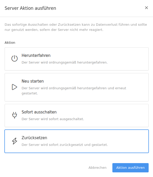 The Reset action switches the server off directly without a proper shutdown and then restarts it.