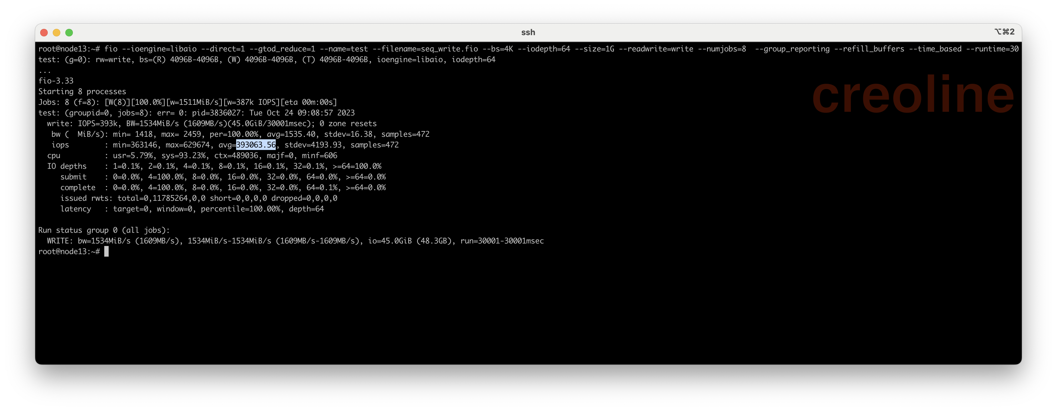 fio --ioengine=libaio --direct=1 --gtod_reduce=1 --name=test --filename=seq_write.fio --bs=1M --iodepth=64 --size=1G --readwrite=write --numjobs=64 --refill_buffers --time_based --runtime=30 Random read (IOPS)